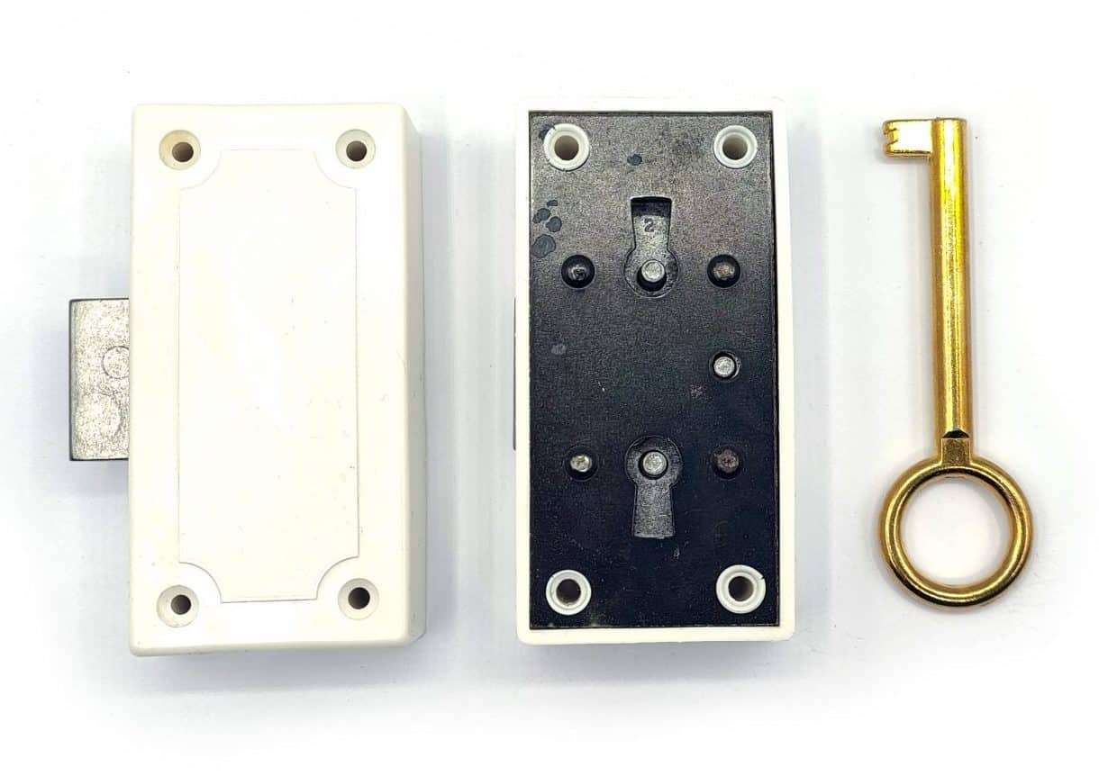 Cerradura Falleba - 15mm - Blanca - Llave cuero viejo